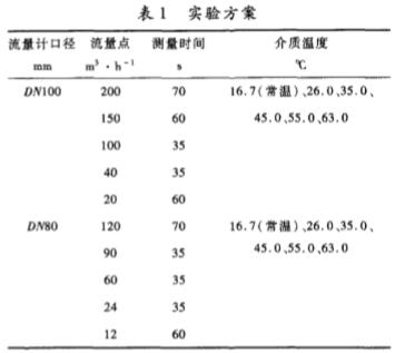 為實驗介質(zhì),選取DN80mm和DN100mm的0.5級電磁流量計,每個測試點測量3次,共180次測試,研究電磁流量計特征系數(shù)隨溫度變化的特性。具體實驗方案見表1。