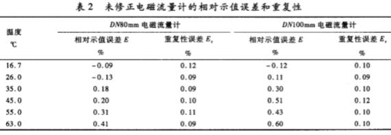 根據(jù)JJG1033—2007,DN80mm和DN100mm電磁流量計在不同溫度下的相對示值誤差和重復性見表2??梢钥闯觯斄黧w溫度在16.7—30.0℃時,電磁流量計的相對示值誤差在40.13%以內(nèi),筆者認為在此溫度范圍內(nèi),介質(zhì)溫度變化對電磁流量計的影響可以忽略。當流體溫度在30~63℃時,電磁流量計的相對示值誤差正差偏,*大誤差為0.60%,對于DN100mm的電磁流量計,其相對示值誤差已經(jīng)超出了0.5級電磁流量計的精度范圍。因此,當電磁流量計用于高溫環(huán)境的高精度測量時,介質(zhì)溫度的影響-定不能忽略。