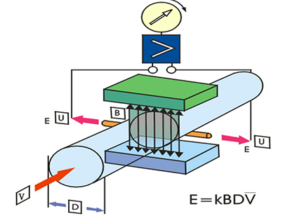 與此相仿.在磁感應(yīng)強(qiáng)度為B的均勻磁場中,垂直于磁場方向放一個內(nèi)徑為D的不導(dǎo)磁管道,由上式可見,體積流量qv與感應(yīng)電動勢e和測量管內(nèi)徑D成線性關(guān)系,與磁場的磁感應(yīng)強(qiáng)度B成反比,與其它物理參數(shù)無關(guān).這就是電磁流量計的測量原理.