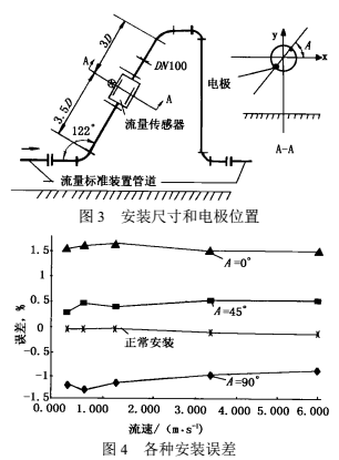 2)實驗證明電*軸線45°安裝比傳統(tǒng)水平安裝(A=0°)受彎管流動擾動影響有很大改善。