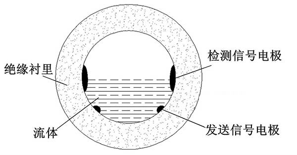 ①多電*式非滿管化工原料流量計。其底部是一對信號注人電*,中間有多對測量電*,頂端有一個滿管電*。在滿管情況下,該流量計與普通的化工原料流量計的功能相同,滿管情況下流體的橫截面積是固定的,此時計算流量值只需要測量流體的流速即可。當流體非滿管時,滿管電*檢測到管道非滿狀態(tài),利用算法修正測量值,此時流量計的測量方式改成測量流體流速和液面高度。信號注人電*與在不同位置的三對測量電*共同工作,用于測量液位面的高度和流體的速度。多電*式非滿管化工原料流量計結構簡圖如圖3所示。