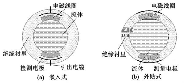 電容式化工原料流量計從根本上解決了電*表面附著、腐蝕、摩擦等問題,其電*與被測流體間有絕緣襯里隔離,或者直接采用絕緣測量管。電*置于測量管外面或鑲嵌于測量管內(nèi)部。嵌人式化工原料流量計和外貼式化工原料流量計的結構如圖2所示。