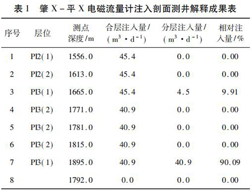 2017 年 9 月在大慶油田采油八廠肇 X - 平 X 水平井注水井中*次進(jìn)行了水平井注入剖面測井現(xiàn)場試驗(yàn)。該井斜深2 055. 42 m,水平段長度為568. 46 m,試驗(yàn)?zāi)康氖峭ㄟ^注入剖面測井了解該井各層段的注水情況,同時(shí)對水平井測井工藝、儀器的適用性、井下牽引器及井口輔助裝置等設(shè)備的工作有效性和可靠性進(jìn)行評價(jià)?,F(xiàn)場試驗(yàn)中,在密閉條件下錄取到了該井的注入剖面測井資料,進(jìn)行了重復(fù)測量,重復(fù)測量結(jié)果在誤差允許范圍內(nèi),測井成果見表 1。該井施工壓力 6. 0 MPa,注入量45. 4 m3 /d,有 7 個(gè)射孔層,分 8 個(gè)測點(diǎn)測量,2 個(gè)層有吸入顯示,其中,P13( 1) ( 1 734 ~ 1 767 m) 層絕對吸入量4. 5 m3 /d,相對吸入量為9. 91 %,P13( 1) ( 1 899 ~1 943 m)層絕對吸入量 40. 9 m3 /d,相對吸入量為 90. 09% ,測井成果見表 1。通過與甲方的交流,再結(jié)合該井的動(dòng)靜態(tài)資料及周圍井的工作狀況,采油廠的地質(zhì)人員認(rèn)為本次測井結(jié)果能比較準(zhǔn)確地反映該井的注入情況。