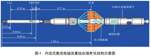 1. 2 內(nèi)流式集流液氯流量計如圖 4 所示,內(nèi)流式集流電磁組合測井儀主要采用內(nèi)流式集流液氯流量計,并組合了井溫壓力磁定位儀。利用電磁感應(yīng)原理測量平均流速,體積流量計算公為: