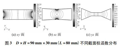 2) 圖 4( a) 、圖 5( a) 的 xy 面權函數(shù)分布表明,H = 30 mm時中心區(qū)域的權函數(shù)等勢線間距較大,且中心區(qū)域的權函數(shù)等勢線逐漸變?yōu)橹本€; 電*附近的權函數(shù)等勢線比較稀疏,且等勢線顏色較淺,權函數(shù)*大值較小,變化梯度小,因 此,H = 30 mm 時 xy 面的權函數(shù)分布更加均勻。