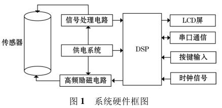 高頻勵磁電鍍廢水流量表由傳感器、高頻勵磁電路、信號處理電路等組成,其中高頻勵磁電路決定著傳感器磁場的強弱,勵磁電路的穩(wěn)定性以及精確性決定著系統(tǒng)檢測的準確性以及穩(wěn)定性。DSP 系統(tǒng)控制勵磁電路激勵傳感器線圈,當線圈中有導電液體流過時,其切割磁感線并在傳感器兩端的線圈上產生感應電動勢,利用信號檢測電路監(jiān)測感應電動勢的大小,*后根據(jù)相應關系計算出液體的流量,系統(tǒng)硬件框圖如圖 1 所示。
