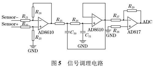 如圖4 所示,信號調理電路由前置放大電路、濾波電路以及二次放大電路組成。其中前置放大電路主要是由 AD8610 組成的差分放大電路構成,其主要是去除信號中的共模干擾并且進行*一次前置放大,前置放大電路的放大倍數(shù)為 15。由于有效信號的幅值很小,經過前置放大電路后信號中還存在很多高頻雜波,這些雜波會影響對后級信號的處理,因此還需要對前置放大電路輸出的信號進行低通濾波和二次放大。系統(tǒng)選用二階有源低通濾波電路濾除信號中的高頻干擾,低通濾波的截止頻率設定在 6 kHz 左右,選用 AD817 組成的二次放大電路對濾波電路輸出的信號進行二次放大,將信號調理電路輸出的信號調整在 0~5 V 之間,*終利用 DSP 內部的 AD 轉換器對此信號進行模數(shù)轉換得出傳感器線圈輸出的感應電動勢,從而根據(jù)相關的公式計算得出管道中液體的流量。具體電路圖如圖 5 所示。