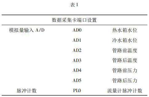 數(shù)據(jù)采集系統(tǒng)由工控機(jī)、潛水電磁流量計(jì)以及數(shù)據(jù)采集卡組成。 4000 次冷熱沖擊試驗(yàn)要求在在*大流量 qs 條件下運(yùn)行,對(duì)流量數(shù)據(jù)的采集用到潛水電磁流量計(jì)及數(shù)據(jù)采集卡。潛水電磁流量計(jì)采集管路流量,數(shù)據(jù)采集卡將潛水電磁流量計(jì)采集到的數(shù)據(jù)反饋給工控機(jī)系統(tǒng)。過程中,試驗(yàn)管路水溫以及水箱水位的采集控制也是通過數(shù)據(jù)采集卡反饋給系統(tǒng)控制。試驗(yàn)過程用到的數(shù)據(jù)采集卡采用研華生產(chǎn)的PCI - 1711。PCI - 1711 是一款多功能 PCI 總線數(shù)據(jù)采集卡,具有 16 路單端模擬量輸入功能、2 路 12位模擬量輸出功能、16 路數(shù)字輸入和 16 路數(shù)字輸出功能、計(jì)數(shù)器功能等。為保證冷熱沖擊試驗(yàn)結(jié)果的準(zhǔn)確性,嚴(yán)要求嚴(yán)格控制管路流量以及管路壓力。因此,管路設(shè)置前后管路溫度、冷熱水箱水位以及管路壓力的采集,管路流量根據(jù)潛水電磁流量計(jì)脈沖計(jì)數(shù)進(jìn)行采集,其數(shù)據(jù)采集卡端口設(shè)置如表 1 所示。