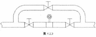 5.被測(cè)介質(zhì)是嚴(yán)重污濁液體過(guò)容易在管道結(jié)垢的液體,可以在安裝傳感器的測(cè)量管道上加一個(gè)旁通管,以便于拆卸清洗。如圖三所示。