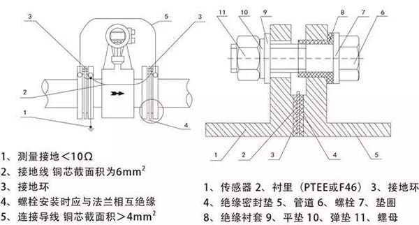 b、在塑料管道上或有絕緣層、油漆管道上的接地方式:傳感器上的兩端面應(yīng)加裝接地環(huán)或內(nèi)置接地電*,使管內(nèi)流動(dòng)的被測(cè)介質(zhì)與大地短接,具有零電位。否則,電磁流量計(jì)無法正常工作。(見下圖)