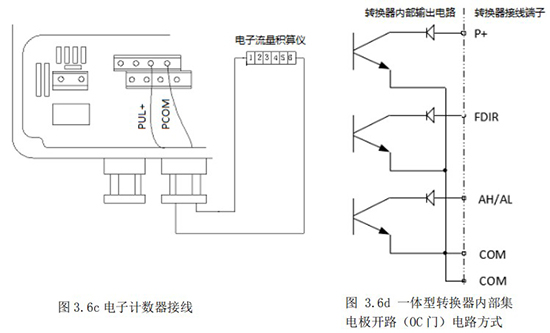 1.5 頻率(脈沖)、上下限報警、流向標示等輸出均為集電*開路的電平輸出信號。