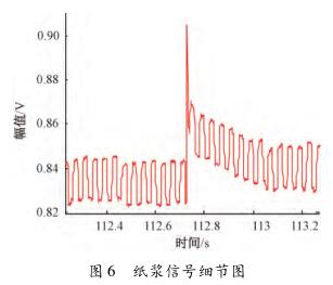 為了進一步研究水煤漿信號的特點,將其與紙漿信號進行對比。通過分析課題組采集的25Hz矩形波勵磁下的紙漿信號發(fā)現(xiàn),在同樣流速下,測量介質為紙漿時,傳感器輸出信號經調理放大后能明顯看到與流量相關的感應電動勢信號,且其漿液干擾僅為數(shù)十毫伏,要遠小于水煤漿信號中的漿液干擾,如圖5所示。對圖5所示的紙漿信號進行局部放大,得到如圖6所示的信號。可見,紙漿信號中的漿液干擾持續(xù)的時間也遠小于水煤漿信號中的漿液干擾,且頻率較低。