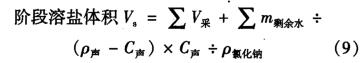 式中:V,為日溶鹽體積,m3; VA為日采鹽體積,m3 ;場余為腔體擴大后未排出液體的溶鹽體積,m3 ; Vip1*a為腔體擴大后未排出液體體積,m3m剩赫為腔體擴大后未排出的液體中等效淡水溶劑質(zhì)量,kg;V排-為日排出液體體積,m3m瑰為日注人液體體積,m3; C排為日排出液體氯化鈉質(zhì)量體積濃度,歲1; C排-為日注人液體氯化鈉質(zhì)量體積濃度,g/l;C注為日排出液體密度,kg/m3 ; p注為日注人液體密度,kg/m3,P氯化鈉為氯化鈉密度,kg/m3 ; p水為水的密度,kg/m3 ; V8為階段溶鹽體積,m3 ; C聲為聲吶測量時腔體內(nèi)氯化鈉質(zhì)量體積濃度,g/1; P聲為聲吶測量時腔體內(nèi)液體密度,kg/m3kg/M。