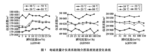 將實驗測得的pvc排水管流量計在不同溫度及流速下的儀表系數(shù)數(shù)據(jù)整理,特性曲線如圖1所示,3組曲線分別對應(yīng)DN40, DN80, DN100的3塊pvc排水管流量計的儀表系數(shù)曲線。